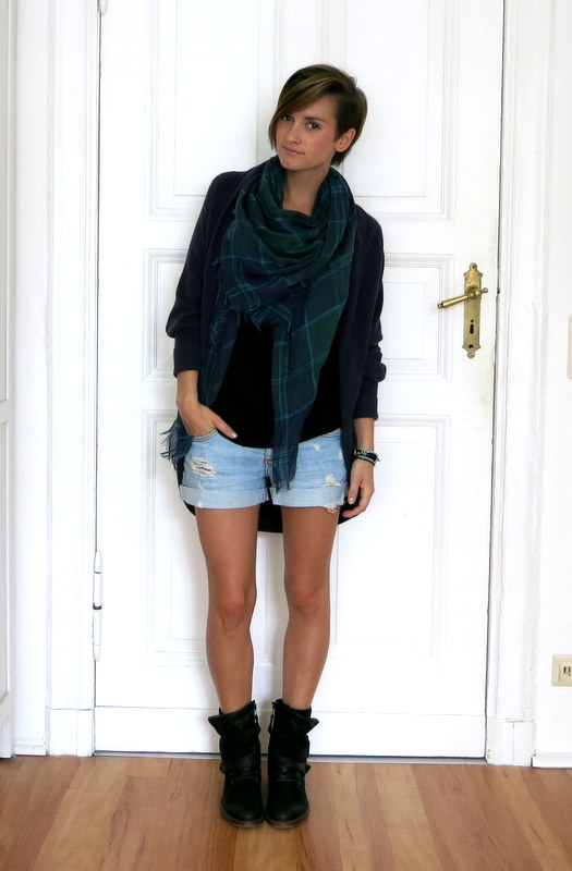 Cardigan - Cotton On, Scarf - Pimkie, Top - Primark, Shorts - Pimkie, Boots - Mjus