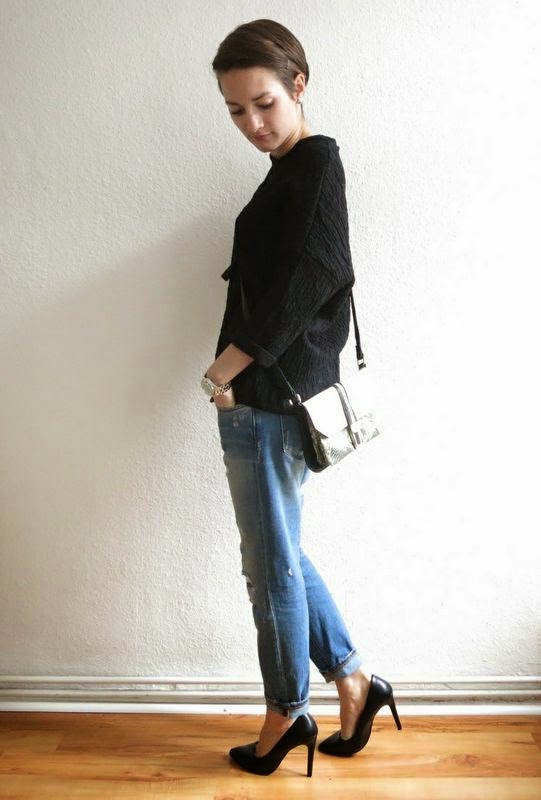Seit ich kurze Haare habe muss ich extrem aufpassen nicht zu jungehaft auszusehen finde ich! Boyfriend Jeans zu einem weiten Pulli nehmen einem dann schnell den letzten Rest Weiblichkeit^^ Da ich diese Teile aber nunmal im Schrank habe und sie auch gerne tragen möchte, kombiniere ich sie einfach zu sehr eleganten Schuhen und einer chicen Tasche! Sicher nicht mein heißester Look, aber mir gefällts :)